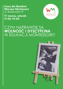 Pojęcia „wolności” i „dyscypliny” są w pedagogice Montessori nierozerwalnie ze sobą związane. Podczas naszego spotkania dla rodziców pokażemy, co one oznaczają w praktyce i jak wzajemnie na siebie wpływają w procesie rozwoju dziecka.